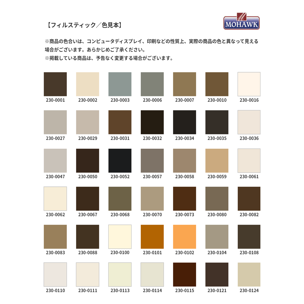 | フィルスティック | 非常に柔らかくコテを必要としないため、作業性が良いです。(※2色混ぜて使用する際は溶かす必要があります。)ごく小さな傷の、簡易補修におすすめです。色数も豊富で茶系カラーに富んでいます。 | パラフィン油脂 | 軟化点:48度 融点:82~93度 |