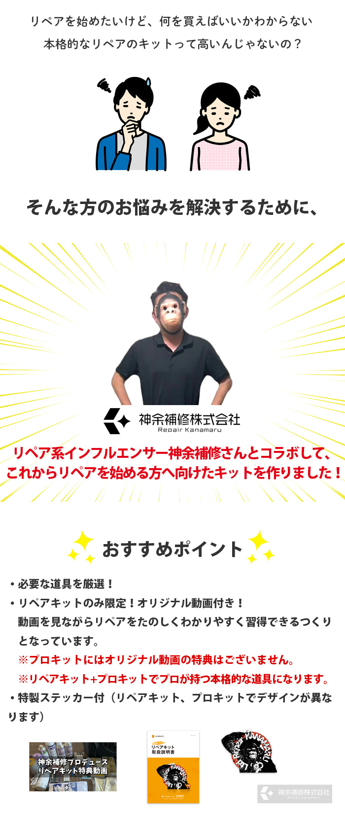 - リペアキットには、限定オリジナル動画ついており、それを見ながらリペアをたのしくわかりやすく習得できるつくりとなっています。