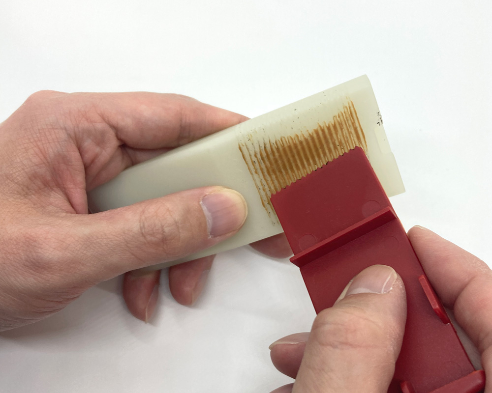 SFA付属のクリーニングコーム(赤キャップ部分)で、ハードワックスをこそげ落とします。