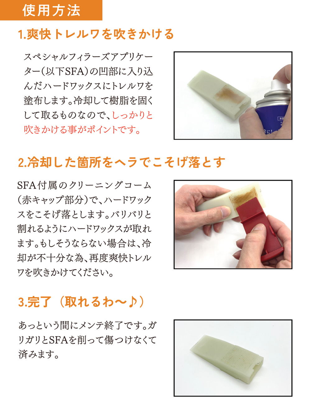 スペシャルフィラーズアプリケーター(以下SFA)の凹部に入り込んだハードワックスに本商品を塗布します。